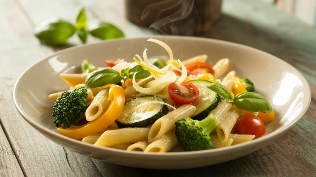 What pasta works best for Pasta Primavera? Medium pasta shapes like penne, fusilli, or farfalle work best because they hold the sauce well. Angel hair or spaghetti can also be used—just be careful to cook it al dente so it doesn’t become mushy.