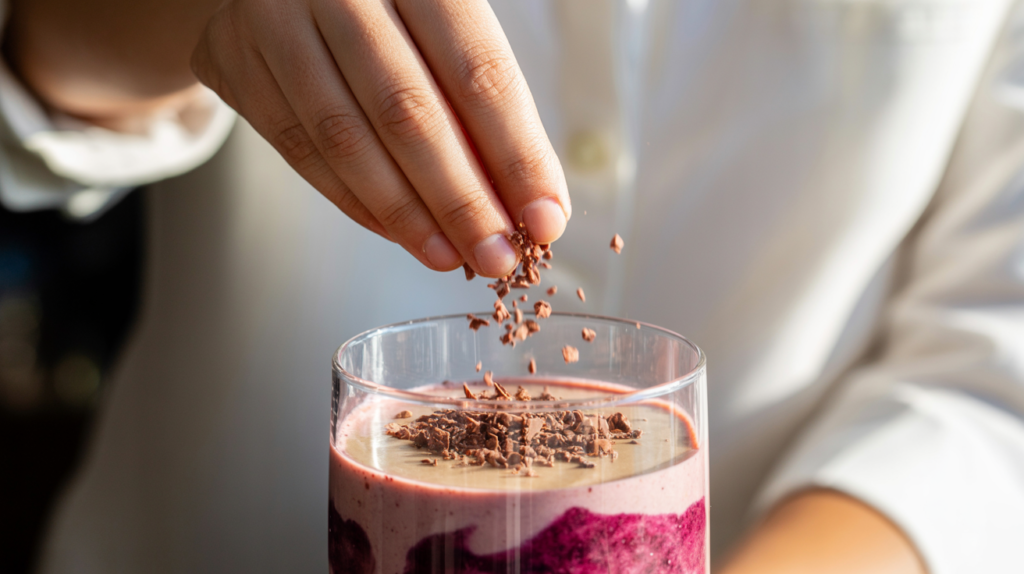 A sprinkle of finely chopped dark chocolate or cocoa nibs on top introduces both a beautiful dark contrast and a hint of extra dessert flavor.