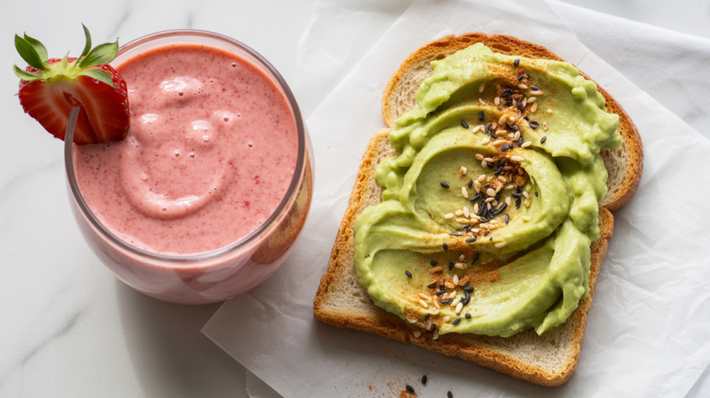 For a savory breakfast, enjoy your smoothie alongside a piece of whole-wheat toast topped with mashed avocado and a dash of everything bagel seasoning. The flavors complement each other beautifully.