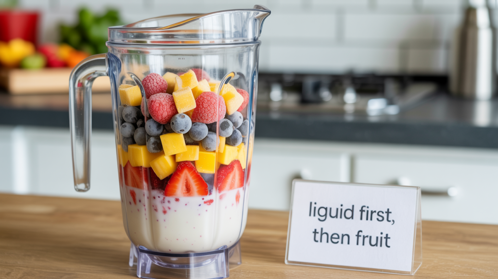 Add your liquid first, then your frozen fruit. This creates a powerful vortex that helps the blades catch and blend the frozen contents quickly and efficiently, ensuring a velvety-smooth blend.