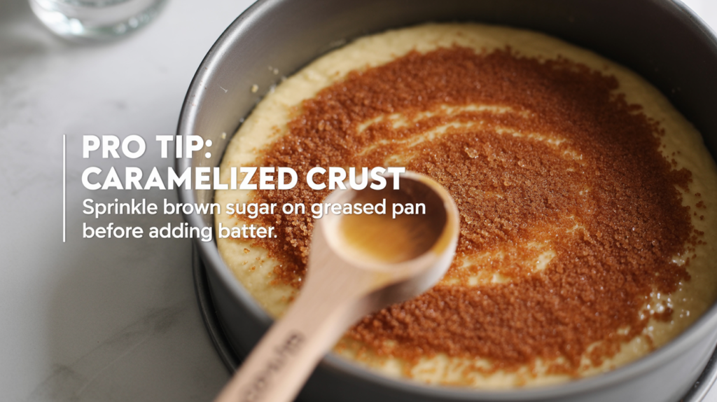If you want a caramelized crust, grease your pan generously with butter and then sprinkle a thin layer of brown sugar over the bottom before adding the batter.