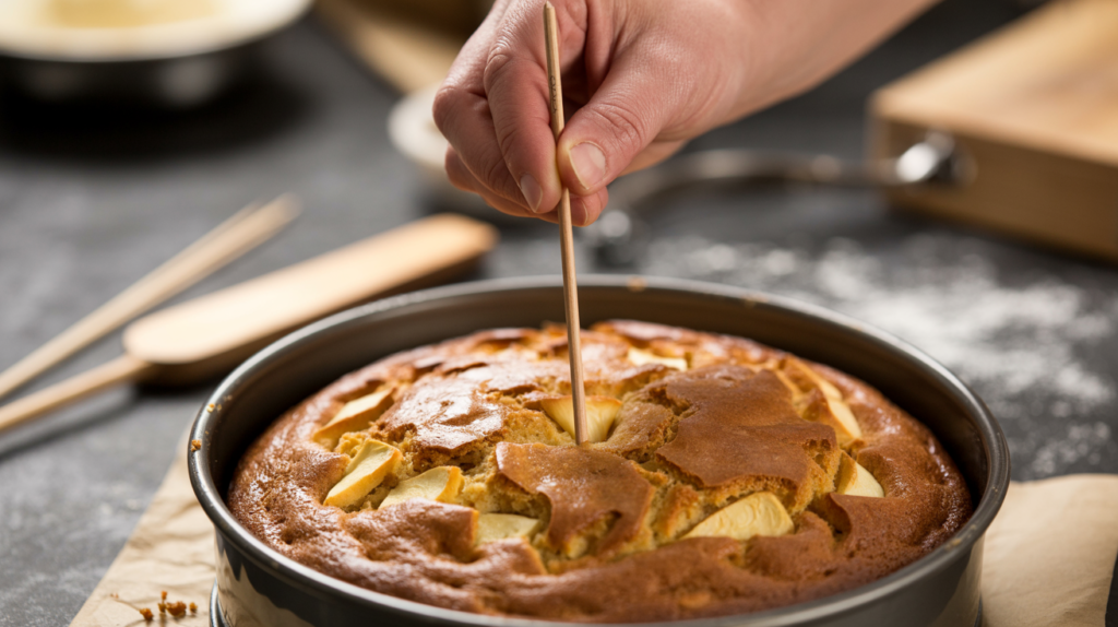 Check the cake for doneness in the center using a long wooden skewer. It should come out with a few moist crumbs attached, not wet batter, which indicates it is perfectly baked.