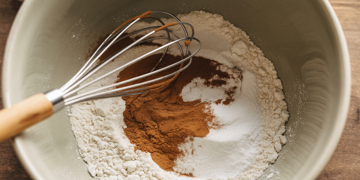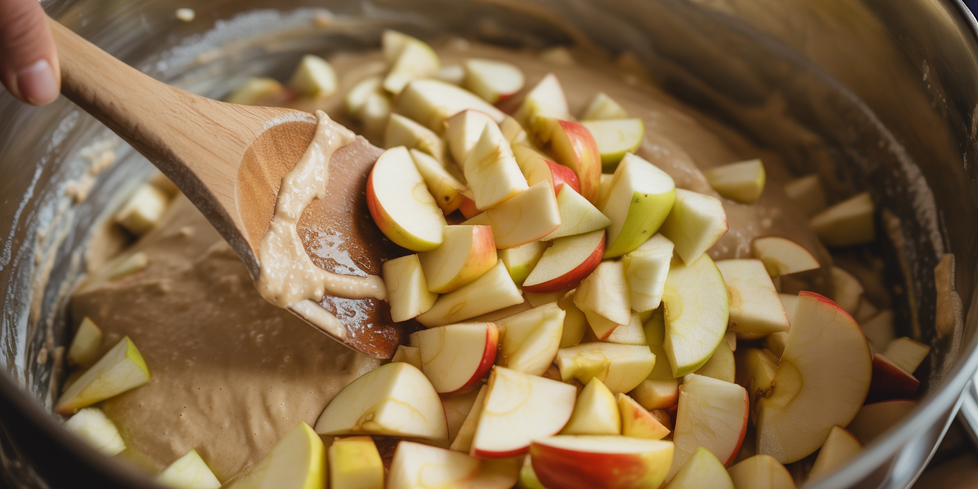 Start by whisking together the dry ingredients — flour, baking soda, and warm spices. Cream the butter and sugar until light and fluffy, then fold in the eggs and vanilla. The batter should be smooth, rich, and fragrant even before the apples join in.