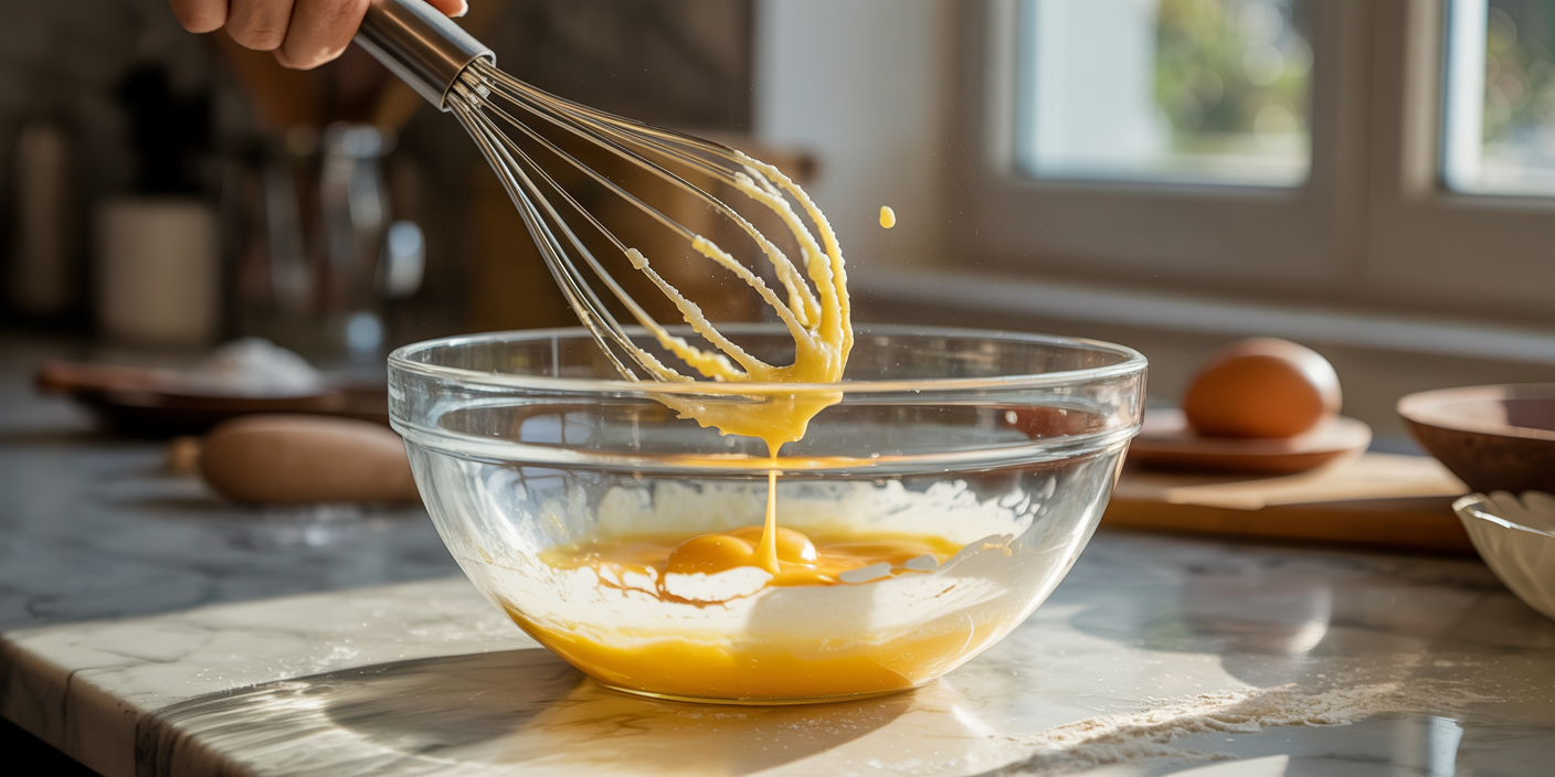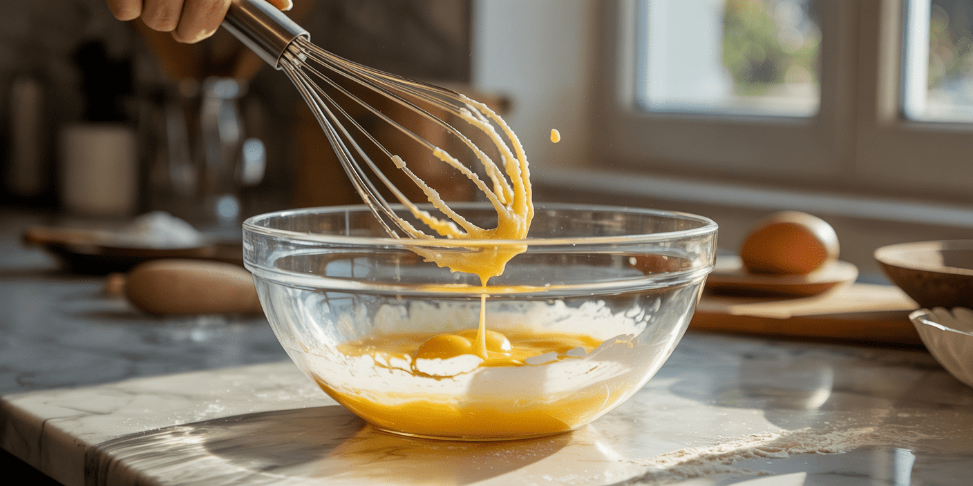 Beat eggs and sugar until pale, fluffy, and doubled in volume.
