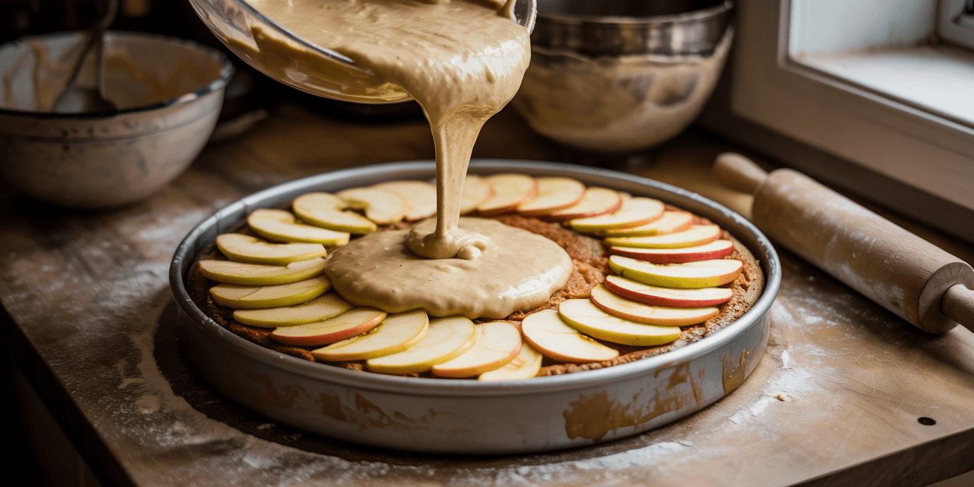 Pour half the batter into a greased pan, layer apple slices, then cover with remaining batter.
