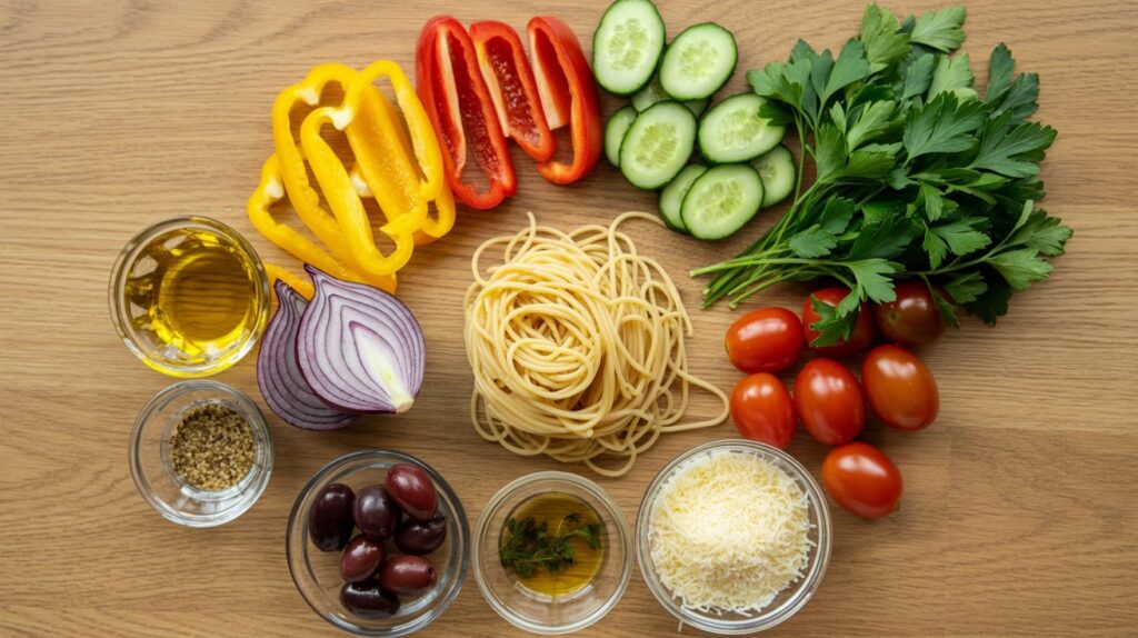 While the pasta cooks, prepare the vegetables. Halve the cherry tomatoes, dice the zucchini, cucumber, and bell peppers, and finely chop the red onion and parsley. Add all the chopped veggies and olives to a large bowl.