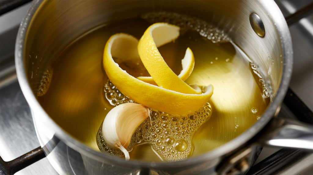 While the pasta cooks, place a large skillet or deep pan over medium-low heat. Add the heavy cream and the lemon zest. Allow this to simmer gently for 2–3 minutes to infuse the cream with the lemon oils. Do not let it boil vigorously.
