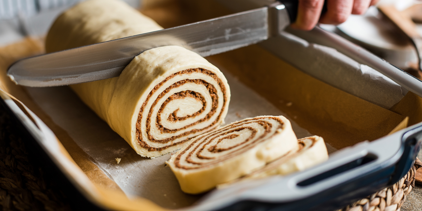 Roll the dough tightly into a log. Slice into even rolls and place in a greased baking dish.