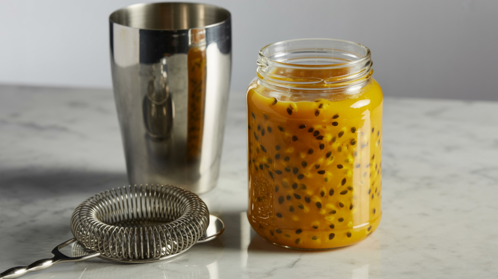 Add vanilla vodka, passion fruit puree, and simple syrup into the shaker. Shake vigorously for 15–20 seconds.