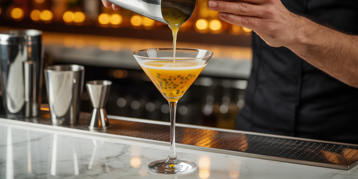 The recipe celebrates fresh passion fruit, creamy textures, and balanced sweetness, embodying modern cocktail innovation while maintaining an elegant and luxurious presentation.