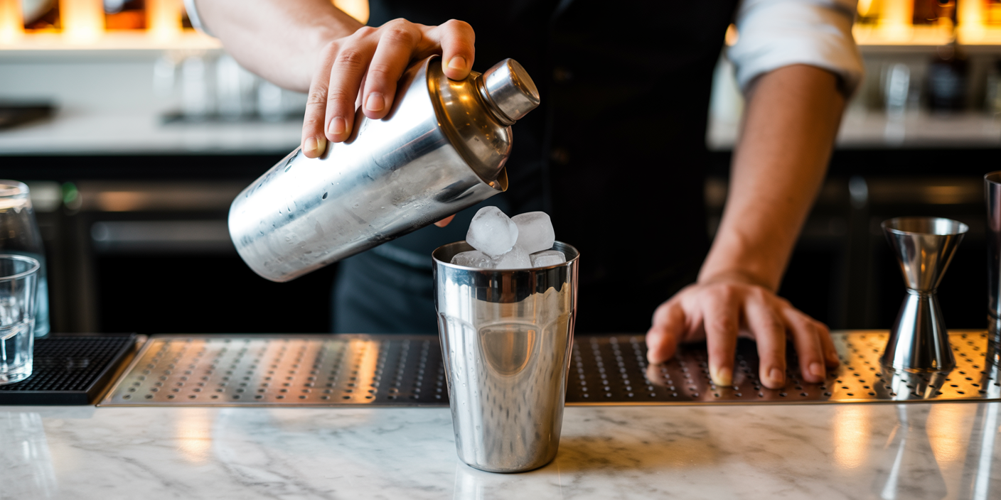 Add ice to a cocktail shaker. This chills the ingredients quickly and helps create a smooth, frothy texture.