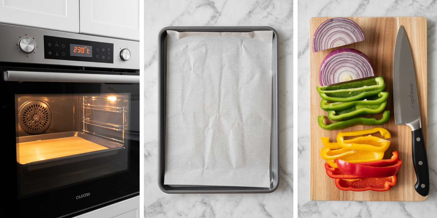 Preheat your oven to 250 C. Line a large, rimmed sheet pan with parchment paper for easy cleanup. Slice the bell pepper and red onion into thin strips.