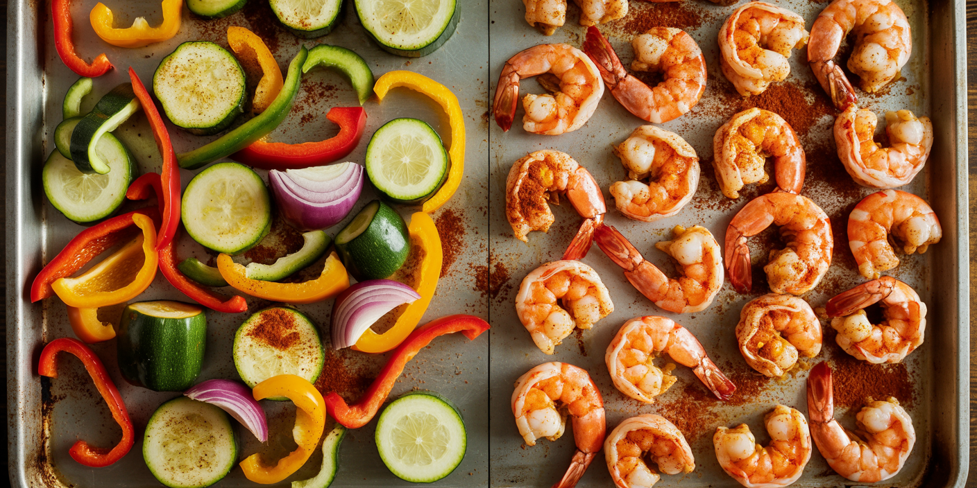 In a medium bowl, toss the sliced vegetables with 1 Tbsp of olive oil. Spread them on one half of the prepared sheet pan. In the same bowl, combine the shrimp with the remaining 1 Tbsp of olive oil, chili powder, cumin, smoked paprika, salt, and pepper. Toss until the shrimp is evenly coated in the seasoning blend, developing a vibrant orange hue. Spread the seasoned shrimp on the other half of the sheet pan, making sure they are in a single layer (this is crucial for a firm, caramelized texture).