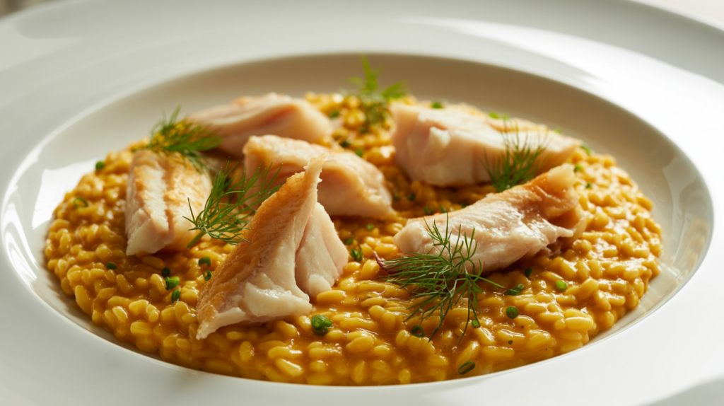 Texture-wise, the risotto must be waving, not stiff. It should spread slightly on the plate. The rice grains must remain al dente (a slight bite in the center), suspended in a velvety smooth sauce with tender flakes of fish.