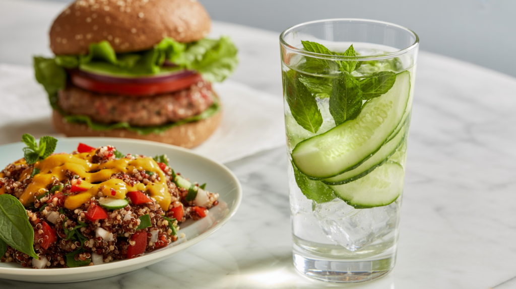 A superb non-alcoholic option is sparkling water flavored with mint, cucumber, and lime. The cooling, fresh notes align perfectly with the Mediterranean flavors of the burger.