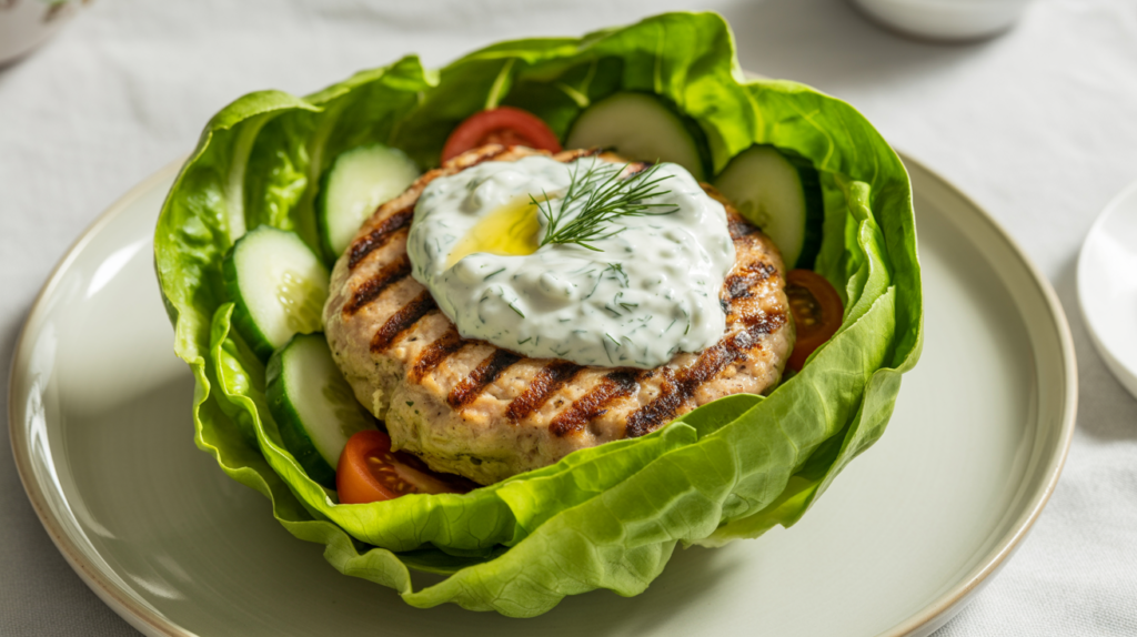 Assemble: Place a cooked patty on the bottom half of a bun (or a lettuce wrap). Top generously with the chilled Tzatziki sauce, and add your fresh toppings (lettuce, tomato, red onion).