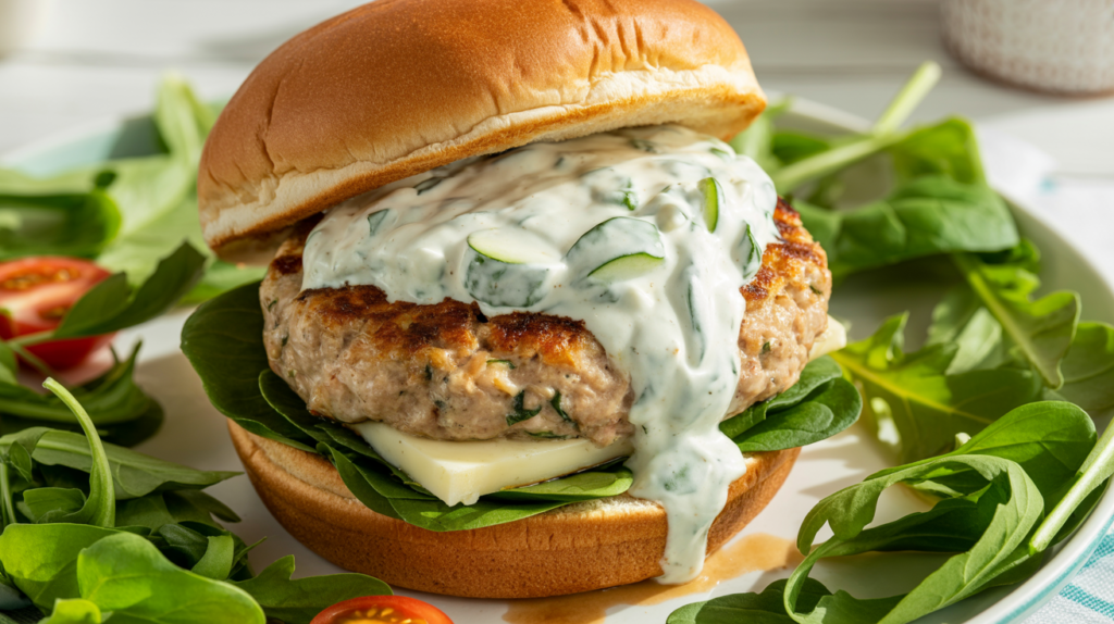 The result is a perfect bite: the soft, yielding patty, the refreshing cucumber sauce, and the necessary structure of the toasted bun, making it an instantly appealing healthy turkey burger.