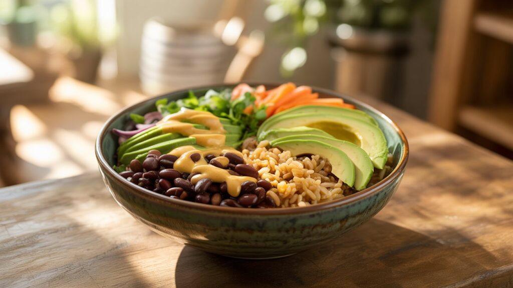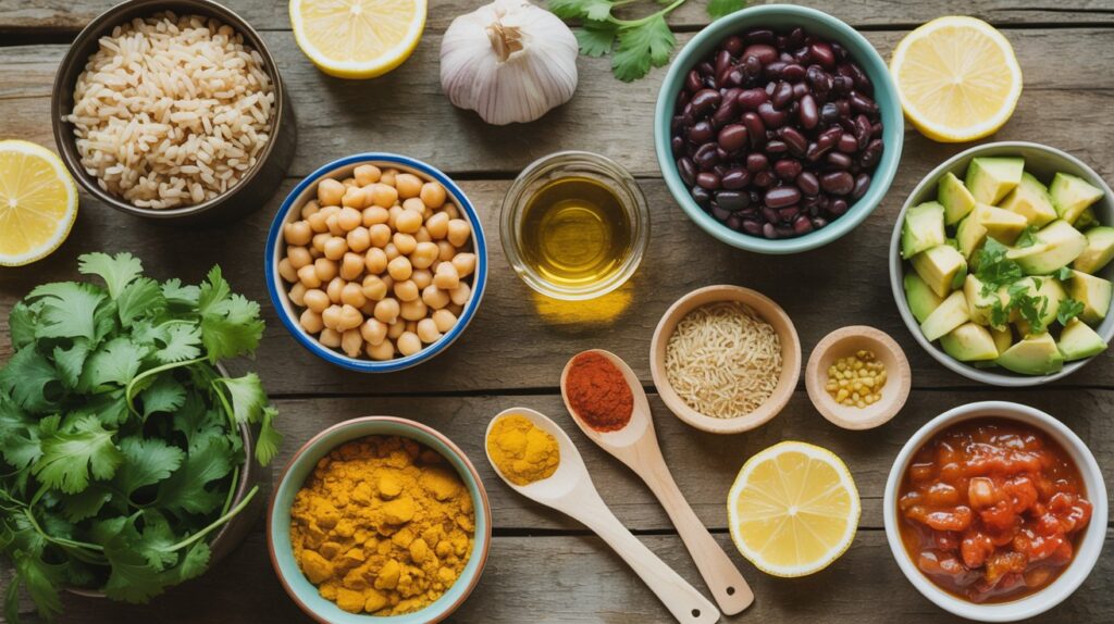Gather simple pantry staples and produce: brown rice, canned black beans, and ingredients for the golden sauce (chickpeas, nutritional yeast, spices). Fresh toppings (avocado, salsa, herbs) brighten the bowl. Here’s what goes in: