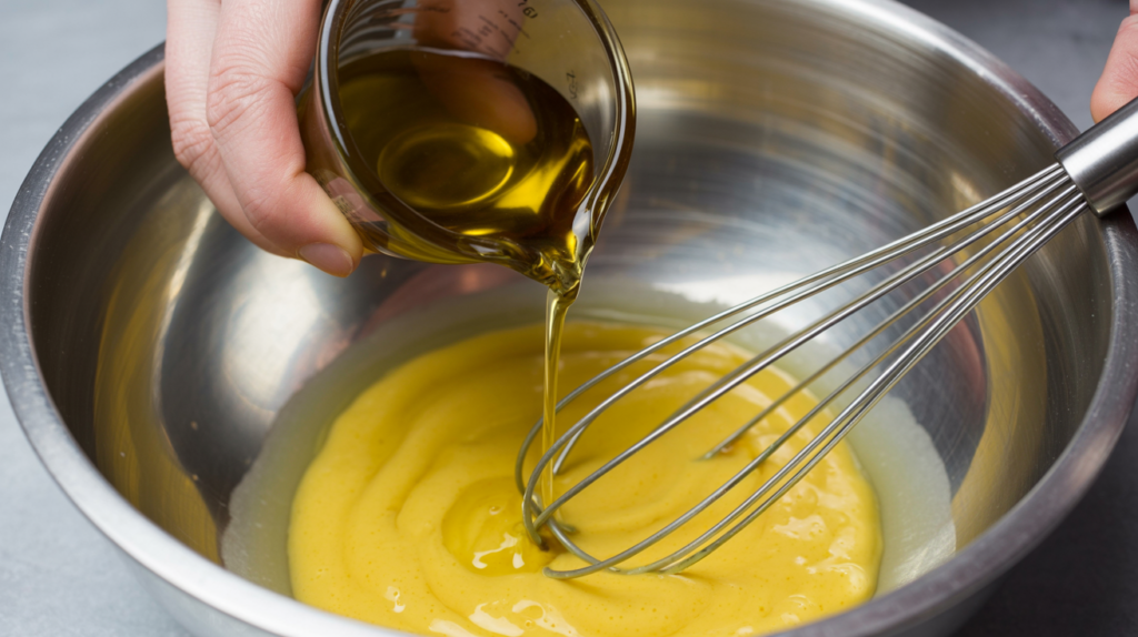 - Drizzle Slowly: When adding the oil, you must add it in a slow, steady stream—drop by drop initially—while continuously whisking. This creates a stable emulsion.