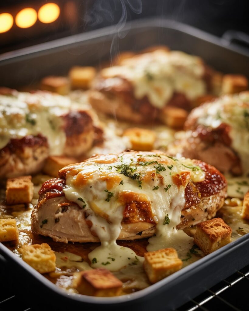One-pan Caesar Chicken Bake is a quick dinner that delivers classic Caesar salad flavor. Chicken is baked under tangy Caesar dressing and melted cheese, then topped with buttery croutons. Ready in under 40 minutes, it’s a flavorful and easy family meal with minimal prep.