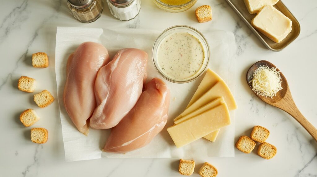 Gather the ingredients below to make this Caesar Chicken Bake. Each adds its own flavor or texture to the dish.