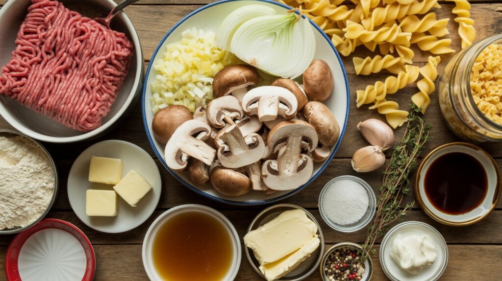 Gather simple, pantry-friendly ingredients for this stroganoff. You need lean ground beef, onions, mushrooms, and basic seasonings. Stir in sour cream and cream cheese at the end for the creamy finish. Below is a table of ingredients, amounts, and pro-tips.