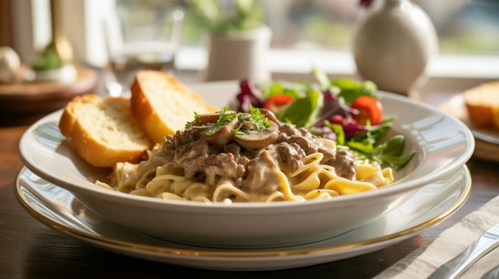 This hearty stroganoff is great on its own but can be paired with a light or green side to balance the richness. Butter-toasted bread or buttered egg noodles are classic. A crisp green salad or steamed broccoli adds color and freshness. For a low-carb meal, serve over cauliflower mash or alongside roasted vegetables.