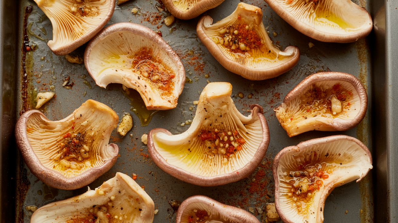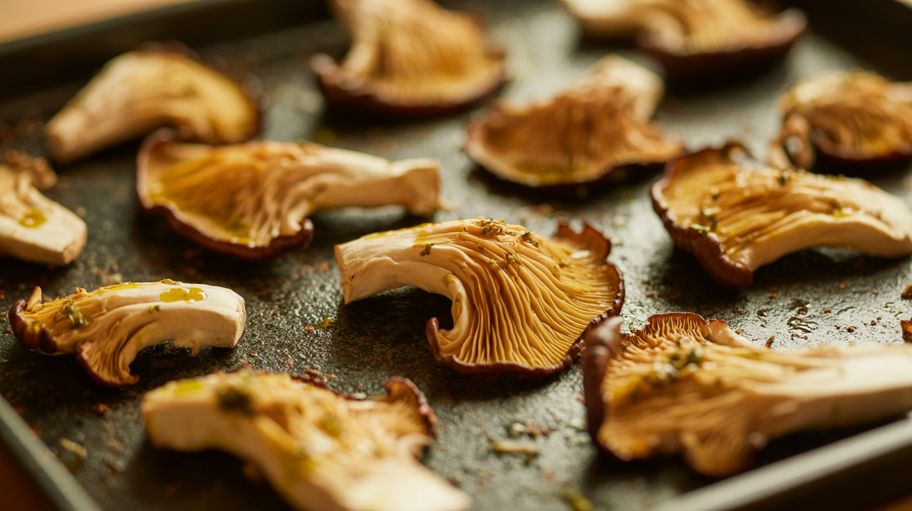 Spread mushrooms evenly on the tray. Roast for 20–25 minutes, flipping halfway through until golden and crisp on the edges.