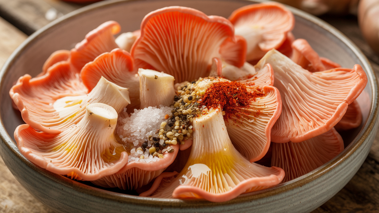 For a bold, rustic twist, try a blend of dried herbs like smoked paprika and oregano. These flavours lend a robust, Mediterranean edge to the pink mushroom.