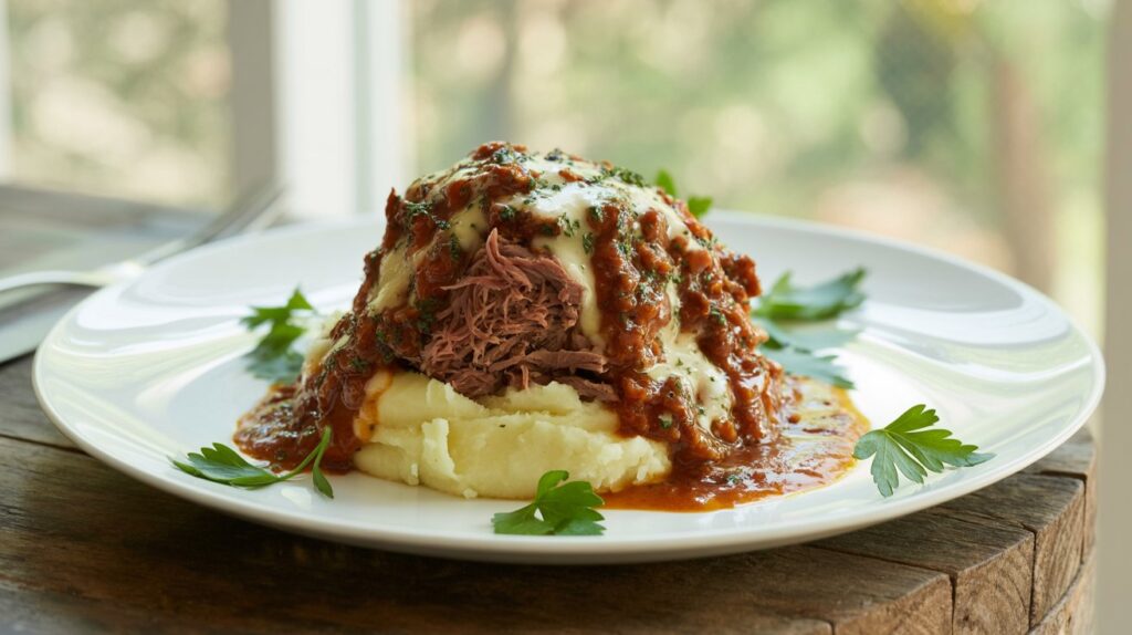 This recipe stands out because of its rich, savory sauce and juicy meat. Sun-dried tomatoes and Parmesan give the gravy a deeply flavorful, slightly tangy profile that you won’t get in a typical pot roast. Braising the beef low and slow in this creamy sauce makes the meat incredibly tender.