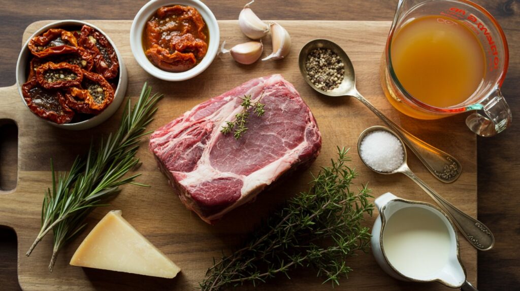 You only need a few key components to create this rich pot roast. The star is beef chuck roast (or a similar cut) for its marbling. We also use sun-dried tomatoes, garlic, beef broth, tomato paste, heavy cream, and Parmesan cheese. Basic pantry spices like salt, pepper, and Italian herbs round out the flavor.