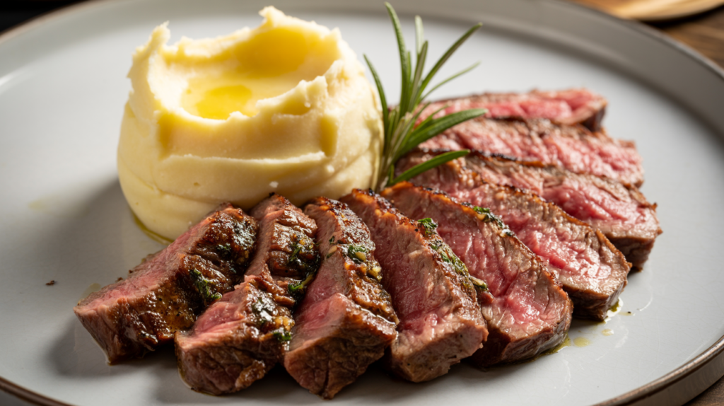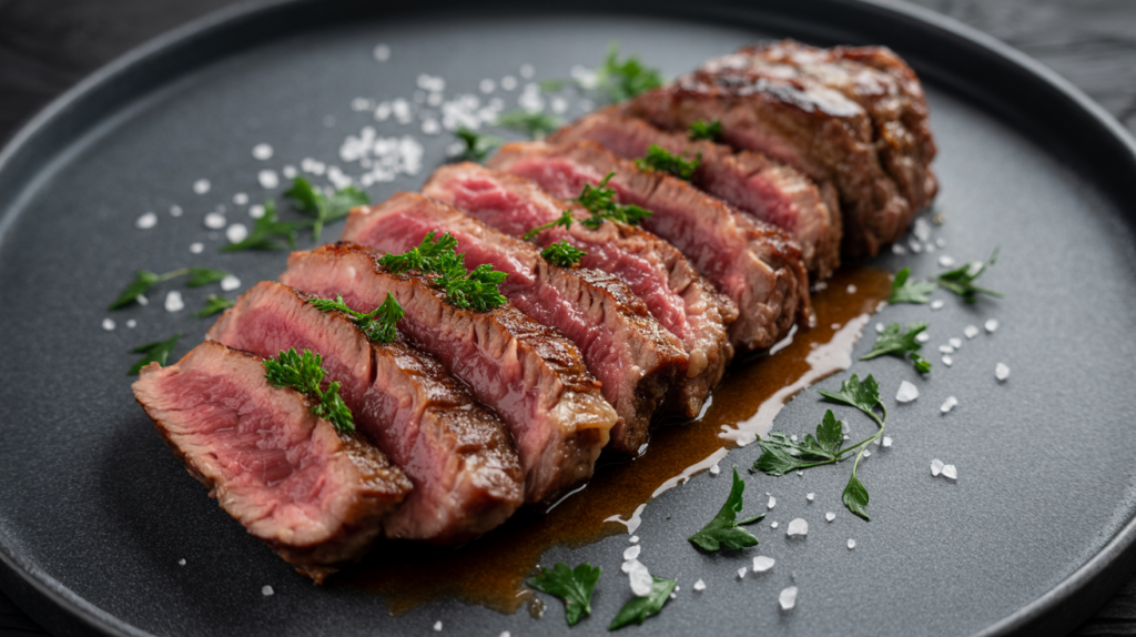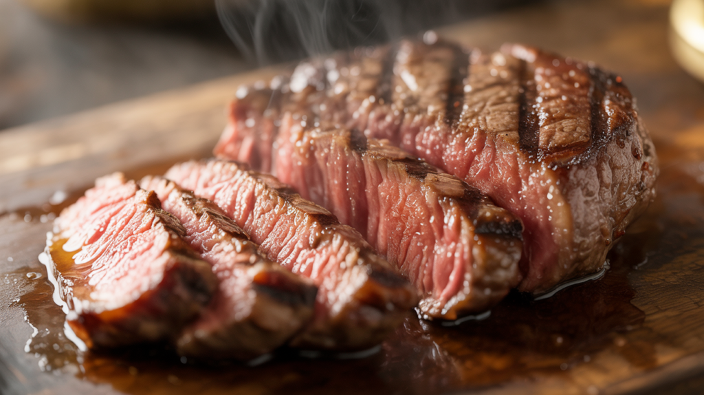 $60^{circ}text{C}$ for medium-rare). Remove from heat and place the steak on a cutting board. Rest for 5–10 minutes before slicing against the grain to retain maximum juices.