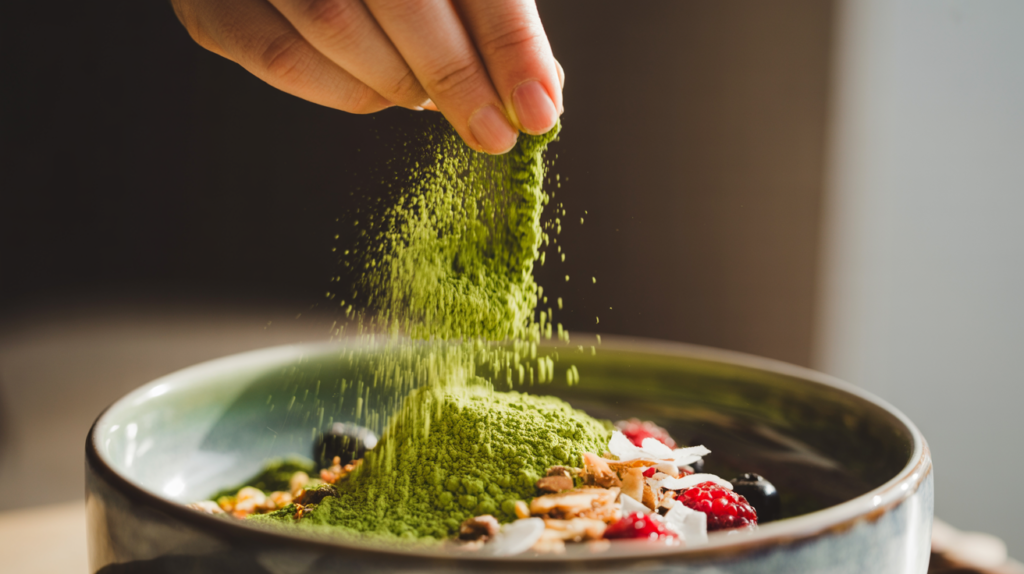 A final, very light dusting of matcha green tea powder over the entire bowl can enhance the green color and add a subtle, sophisticated note.