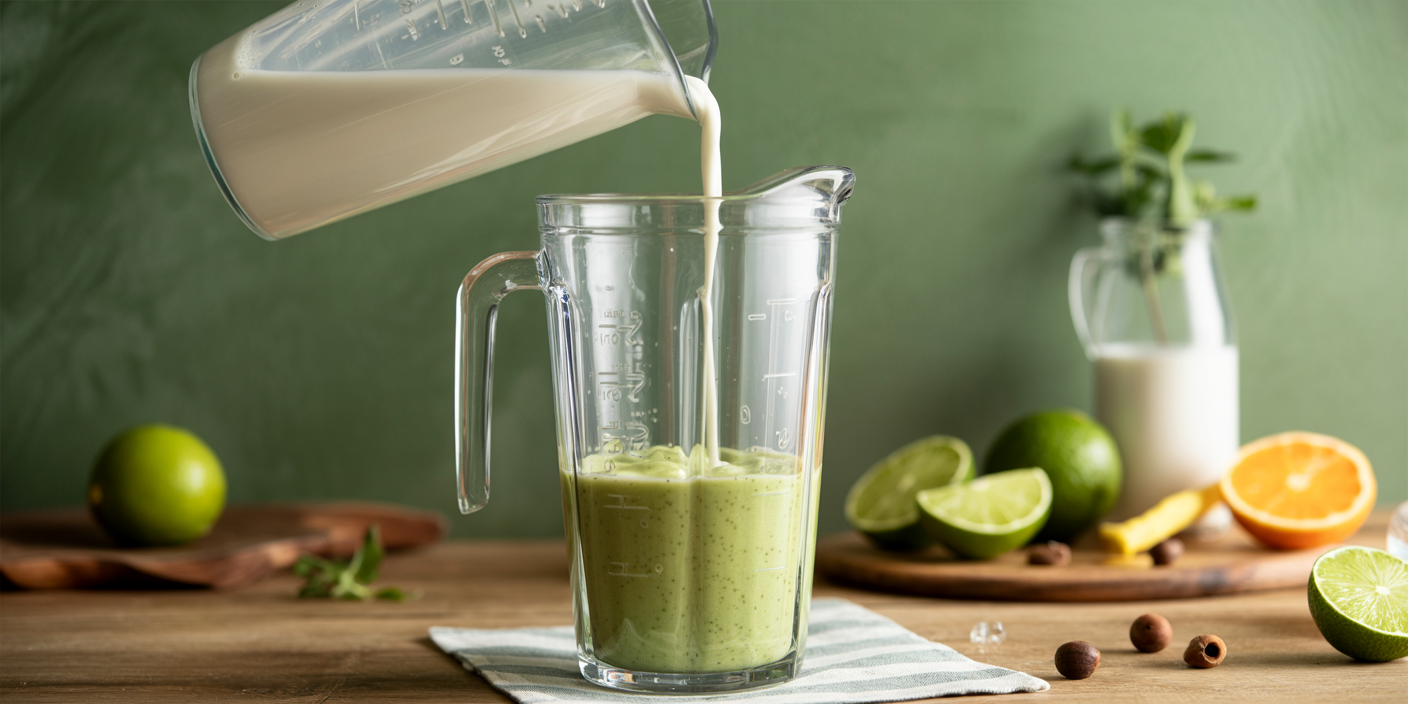 - Pour in the Liquid Base: ½ to ¾ cup almond milk or coconut milk