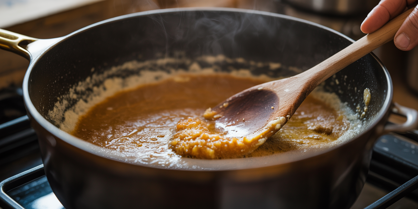 In a saucepan, melt butter and add flour. Stir constantly until it turns golden-brown and nutty.