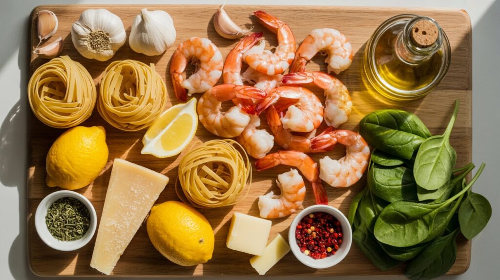 The magic of this shrimp pasta lies in its simplicity and flavor. Sautéing garlic in olive oil and butter releases a wonderful aroma that infuses the shrimp. Adding baby spinach and Parmesan at the end creates a silky sauce that clings to the pasta. And because it’s a one-pot meal, cleanup is a breeze! You’ll notice how the pasta perfectly absorbs the garlicky, buttery sauce. Next, gather the simple ingredients you’ll need.