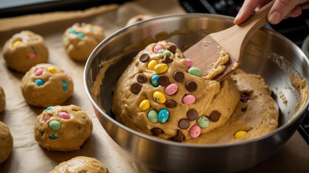 Gently fold the Cadbury Mini Eggs and chocolate chips into the dough until evenly distributed.