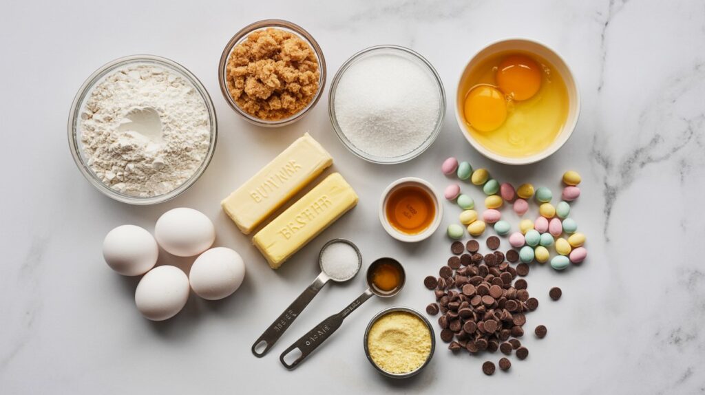 Gather these simple ingredients to make Mini Egg Chocolate Chip Cookies: