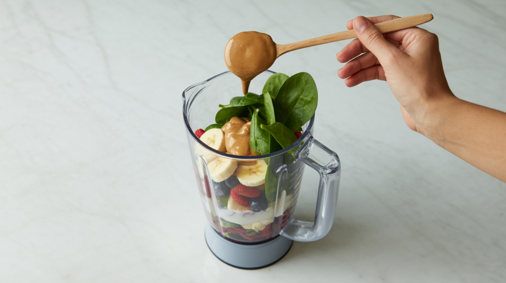Pour almond milk first, then banana, berries, and Greek yogurt. Add honey if desired.