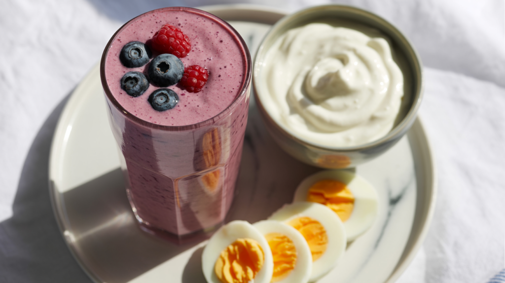 Because the Mixed Berries and Banana Smoothie is so naturally sweet and carbohydrate-rich, pairing it with a simple protein or fat source creates a perfectly balanced meal.