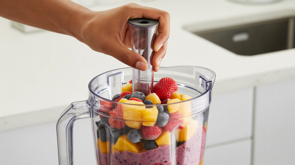 If your blend is too thick, resist adding a lot of extra liquid. Instead, add just a tablespoon of liquid at a time, or use the blender’s tamper tool to push ingredients toward the blades for a velvety consistency.