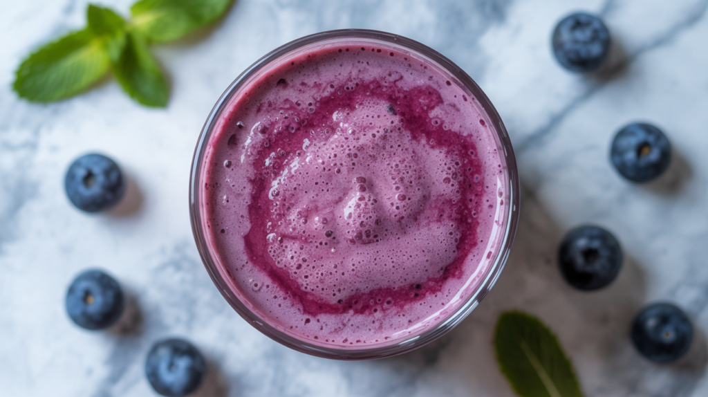 A final touch of elegance is a few fresh mint leaves placed on top—the green color provides a beautiful contrast to the deep purple smoothie.