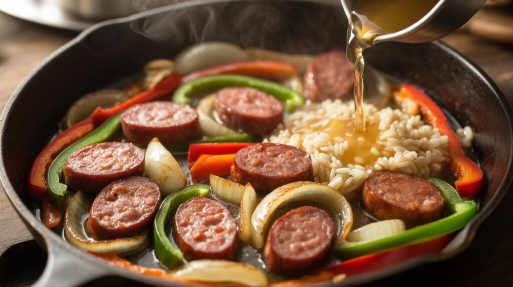 - Sear the Sausage: Don’t skip browning the sausage first. Searing adds deep smoky flavor and renders out fat that seasons the rice.