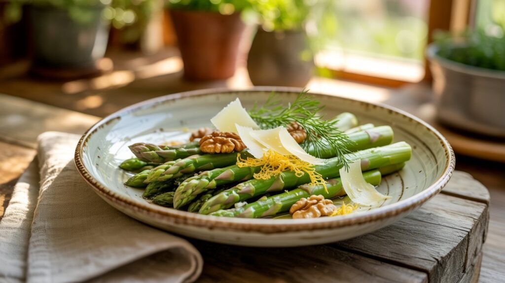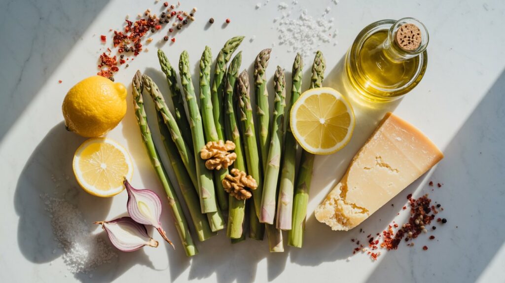 This recipe stands out because it highlights the fresh crunch of asparagus and simple, bold flavors. The secret is to slice the asparagus very thin so each piece absorbs the dressing while staying crisp. A simple dressing of lemon juice, olive oil, and lemon zest wakes up the asparagus. Then we toss in toasted walnuts and shaved Parmesan for a savory, nutty depth. There’s no cooking required—everything stays crisp and bright with maximum flavor.