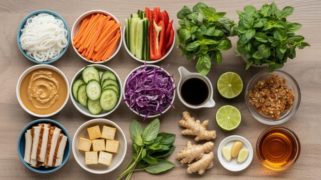 Below are the key ingredients for a Spring Roll Bowl that’s fresh, colorful, and satisfying: