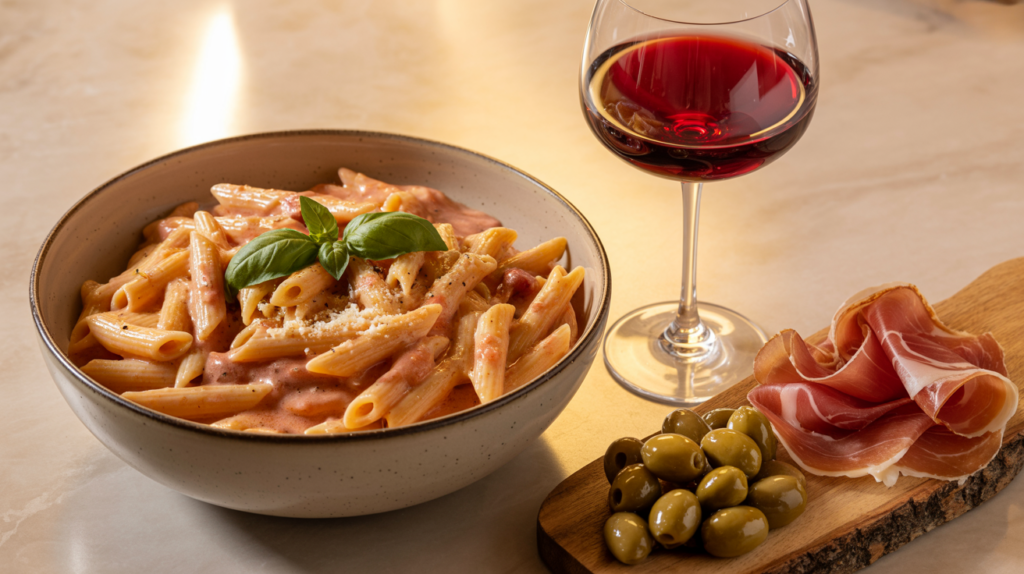 The rich and creamy nature of Pasta alla Vodka makes it pair wonderfully with specific beverages and lighter appetizers.