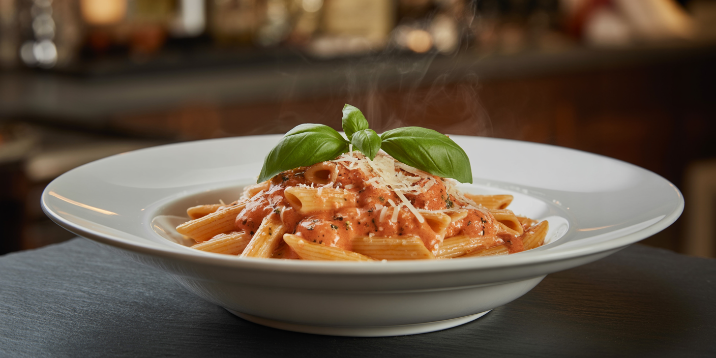 Presentation transforms a home-cooked meal into a dining experience. The Best Pasta alla Vodka is visually striking due to its color, so it pairs best with simple, clean aesthetics.