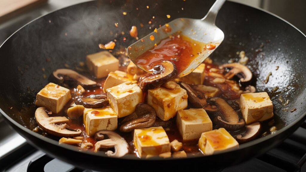 Add the sliced mushrooms to the pan with the tofu. Pour any remaining marinade into the pan. Stir-fry on high heat, tossing constantly, for 2-3 minutes until the mushrooms soften and the sauce thickens slightly.