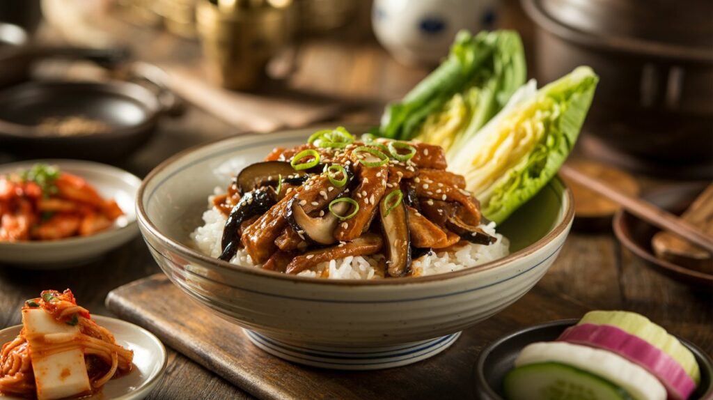 Vegan Bulgogi is a plant-based version of Korean BBQ beef, using tofu and mushrooms marinated in a sweet-savory sauce. It mimics the rich flavor of traditional bulgogi without any meat.